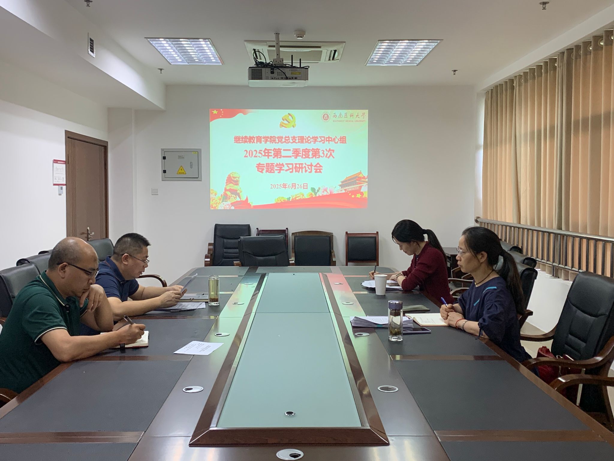 6月25日,继续教育公司党总支理论学习中心组2025年第二季度第3次专题学习研讨会在德诚楼1012会议室召开。本次会议以“深入贯彻中央八项规定精神学习教育”为主题,由公司党总支书记陈忠健主持。