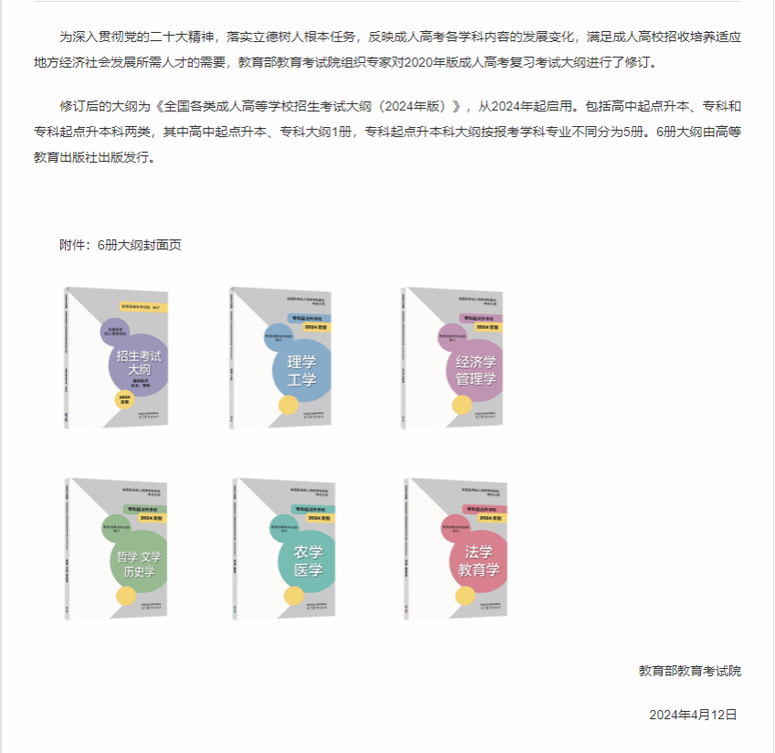 根据教育部教育考试院通知,《全国各类成人高等公司招生考试大纲(2024年版)》从2024年起正式启用,考生请及时购买及查阅,以便提前复习备考。